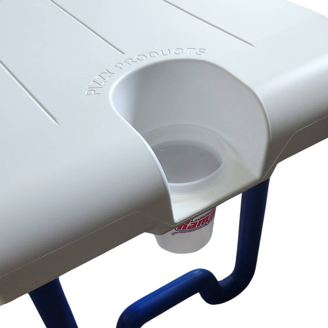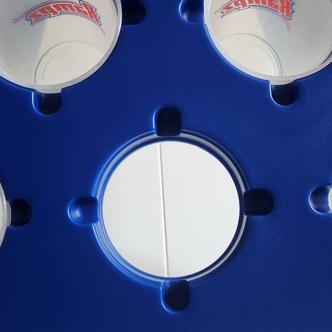 Calculated tapered cuts allow cup lid to sit beneath the surface of the target face, ensuring cups are stable and do not interfere with the bean bags. Finger grooves will make removing the cups easy.